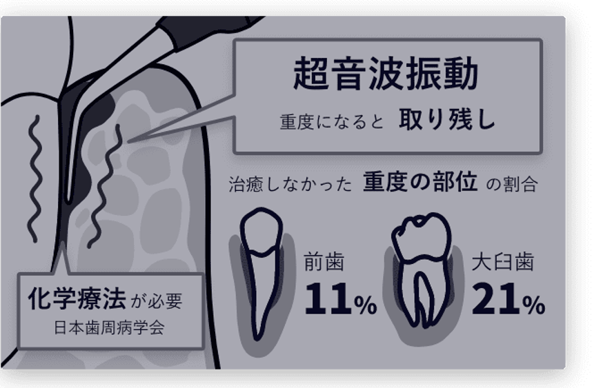 重度になると口腔内細菌が存在する歯石の取り残しが増え、治癒が難しくなります。取り残した部分には、抗菌薬の投与と いった副作用を伴う化学療法が必要になります。