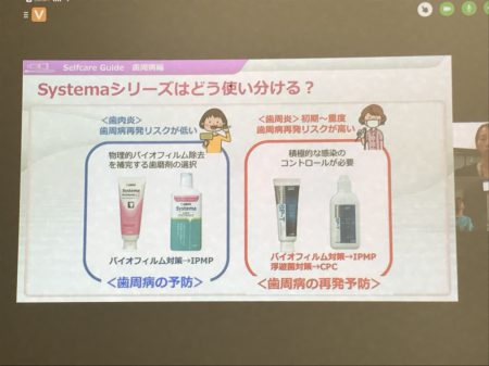 患者様に合わせたセルフケアの道具や歯磨剤の提案は患者様のリスクや口腔内の状態に合わせて行っていましたが、どちらかというと歯ブラシ指導やフロス、歯間ブラシなどの補助的な道具のスキルアップばかりを見ていたところもあり今回のセミナーは非常に勉強になりました^_^
