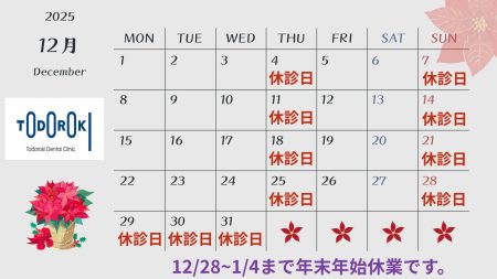 2025年12月8日 12月の休診日のお知らせ ☆12月28日~2026年1月4日まで年末年始のため休診となります。 2026年1月5日午後2時~診療開始いたします。 よろしくお願いいたします。 いいね:いいね 読み込み中... 一覧へ戻る